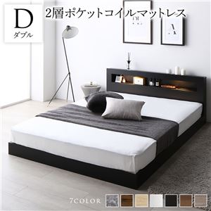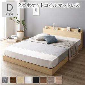 ベッド ダブル 2層ポケットコイルマットレス付き ナチュラル 低床 照明 棚付 宮付 コンセント すのこ送料無料
