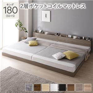 ベッド キング 180(SS+S) 2層ポケットコイルマットレス グレージュ 低床 連結 照明 棚付 宮付 コンセント すのこ送料無料