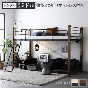 おしゃれ シングル 異素材MIXデザイン ロフトベット〔 シングル ミドルタイプ 薄型3つ折りポケットコイルマットレス付き ブラウン×ブラック 〕 スチール 頑丈送料無料